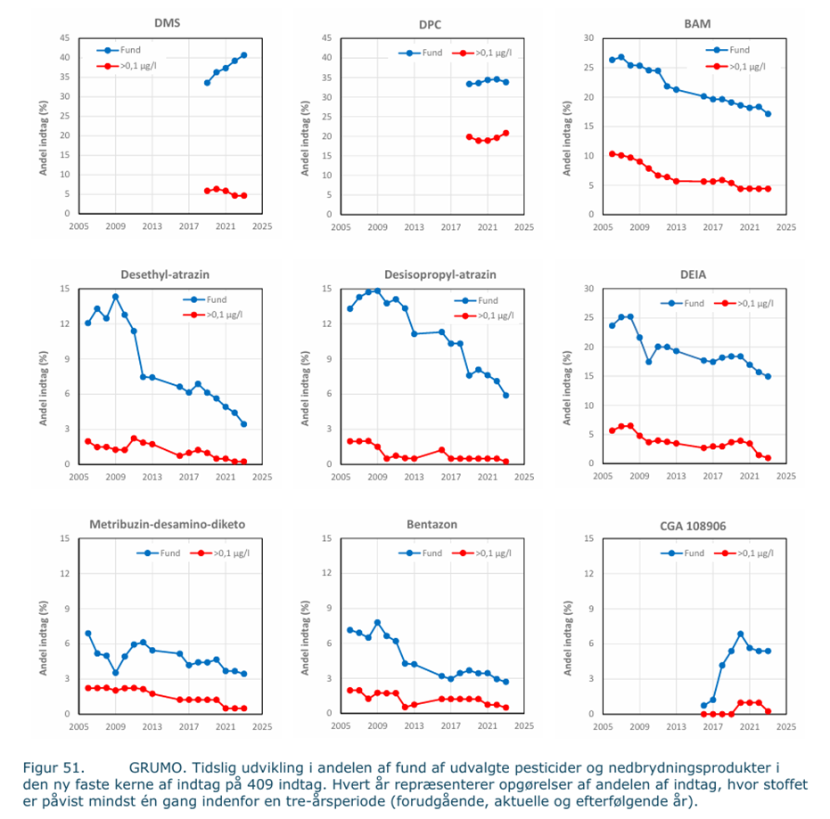 I 2025 blev der testet 2002 vandværksboringer ud af i alt ca. 6500 boringer, det vil sige, at man testede knap en tredjedel. Ud af de 2002 blev der fundet pesticidrester i 1106 boringer svarende til 55,2%. Af dem var der 277=13,8%, hvor fundet af pesticidrester lå over grænseværdien på 0,1 µg/L.